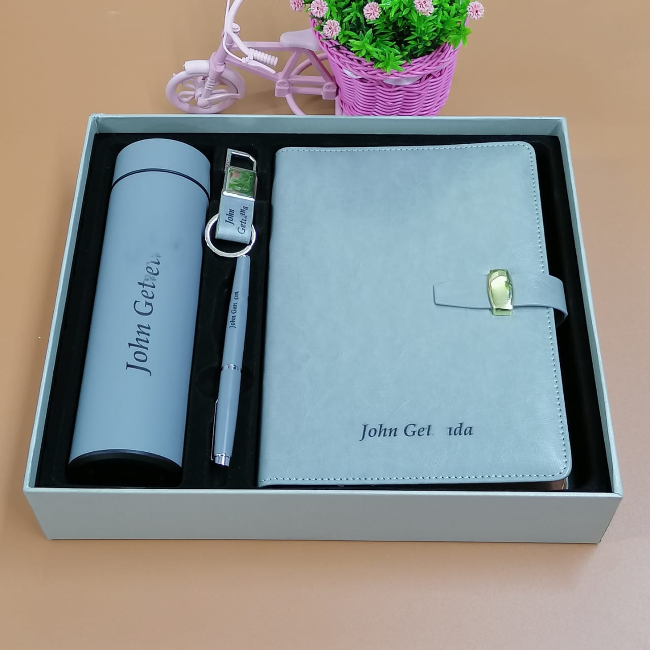 Corporate Logo Gift Bundle is designed for just that. It includes a 500 ml thermal flask to keep drinks hot or cold, a stylish A5 notebook for taking notes, an executive pen for signing documents, a durable keyholder, and it all comes neatly packaged in a premium box.