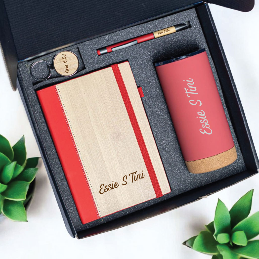 Eco-Friendly Red Corporate Gift Set, thoughtfully curated for businesses that value sustainability and style. This vibrant set includes a bamboo executive pen, a 500ml red thermal flask, an A5 notebook, and a wooden keyholder—each piece designed for elegance and practicality. Every item can be branded with your company’s logo or personalized message, creating a memorable keepsake for clients, employees, or partners.