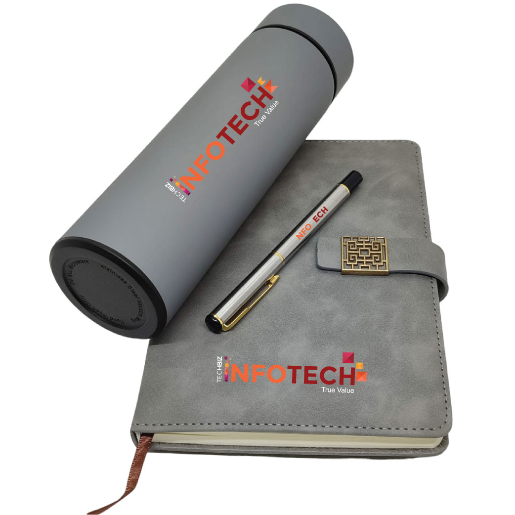 Introducing the Elite Corporate Trio Gift, crafted for organisations committed to professional excellence. Featuring a premium A5 notebook with quality paper, an insulated vacuum flask to maintain beverage temperature, and a sleek pen with smooth ink flow. Each item is fully customizable with your company logo or message, ensuring your brand is prominent in every use. This set is perfect for rewarding high performers, thanking clients, or delivering striking gifts at executive events. Packaged with care, it reflects attention to detail and positions your company as one that values both form and function.