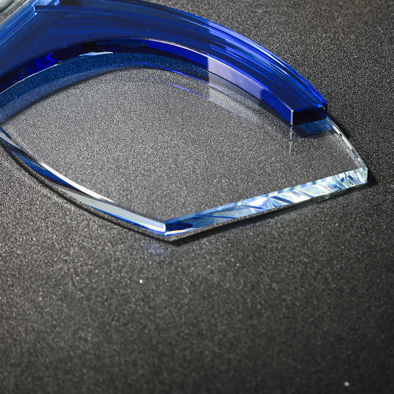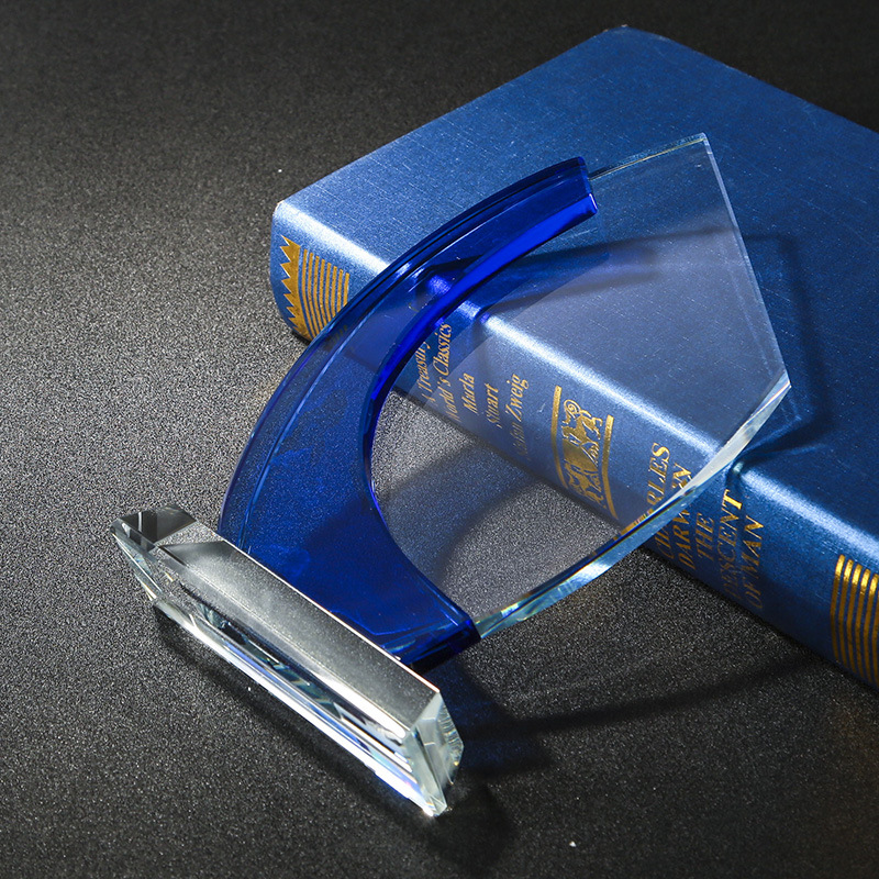 Personalized Crystal & Blue Glass Trophy—a distinguished retirement award that seamlessly blends clear crystal and blue glass to honor years of dedicated service. Standing at 9 inches tall, this trophy features a sleek, modern design with a blue glass accent, symbolizing the transition from a vibrant career to a well-deserved retirement.
