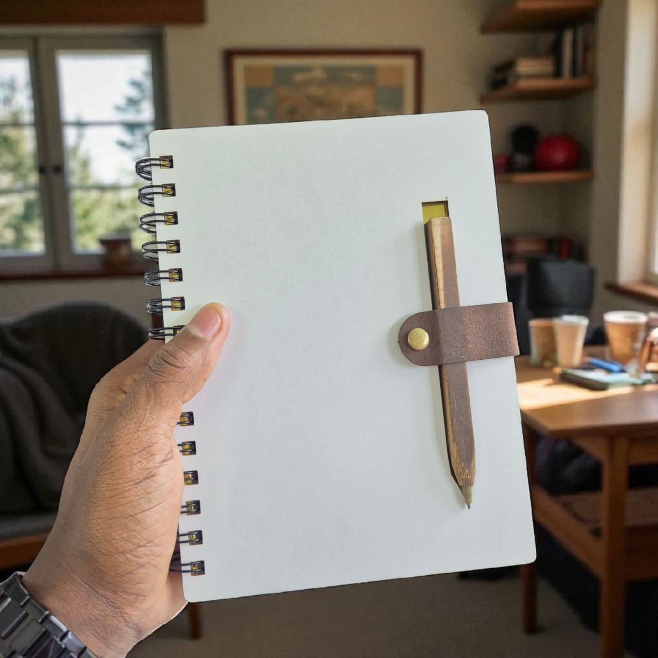Impress clients or recognize staff with the Wooden Spiral Notebook & Pen Set. This notebook features real wooden covers (front and back) that give a warm, professional look and feel. The spiral binding lets the book lay flat when open, making writing or sketching easier. It includes a matching wood or wood-accented pen, held securely in a built-in pen holder.